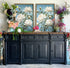 Introducing our elegant 4-door, 4-drawer Novah console with timeless appeal. Crafted with sophistication in mind, its stunning black finish and contrasting warm sparrow stained top. The four columned provide sturdy support, and the breakaway front the console's overall grace and offers dimension and interest. Ample storage awaits behind the four doors and within the spacious drawers, making it both a functional and stylish addition to your home.