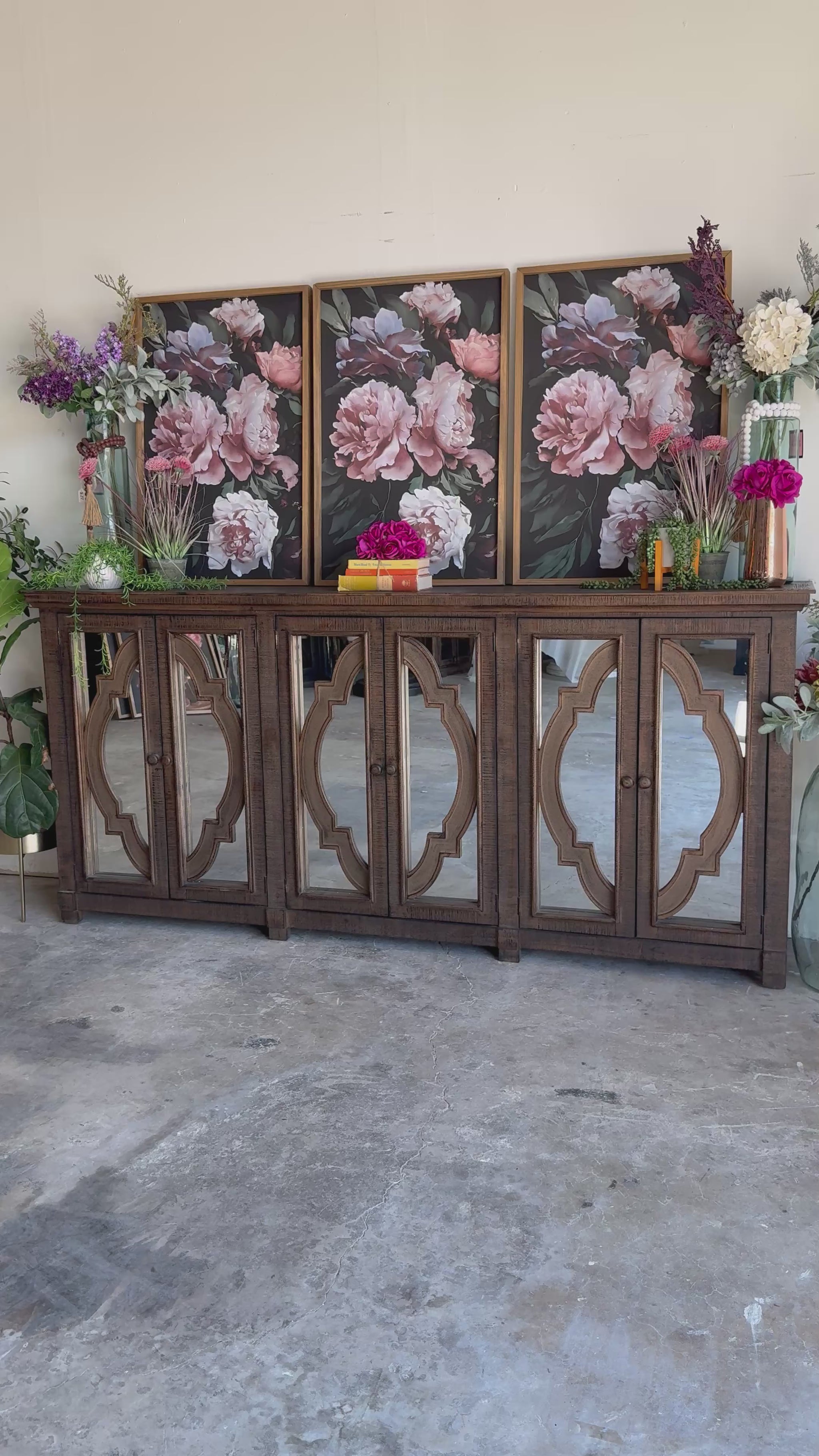 This one is heart-clutchingly beautiful!! This large Brocade 6-Door Console has it all. Style, storage, and one of our favorite brocade designs on the doors. She comes in a our exclusive Honeywood™ finish with beautifully mirrored doors that adds to her glam factor. Use her as a media console, an entryway piece, a buffet-- anywhere you have a long wall!