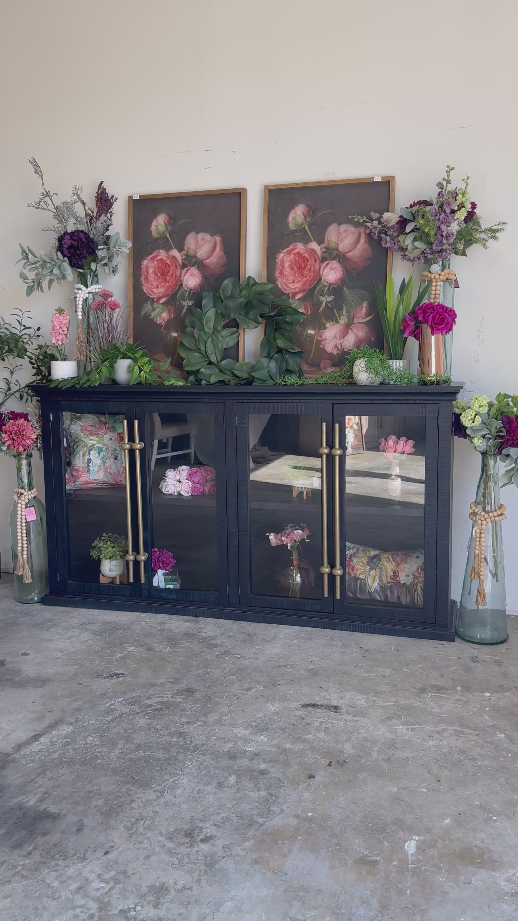 Introducing the Emerson 4-Door Console, a sleek and gorgeous addition to any room. This stunning console features four glass doors that add a touch of sophistication and brightness to your space. The classic molding along the top and the exquisite long gold handles enhance its elegant design. Finished in a dramatic deep blue finish and contrasted with those stunning long gold handles, the Emerson console perfectly blends style and functionality, providing ample storage while serving as a beautiful focal point in your living room, dining area, or entryway.
