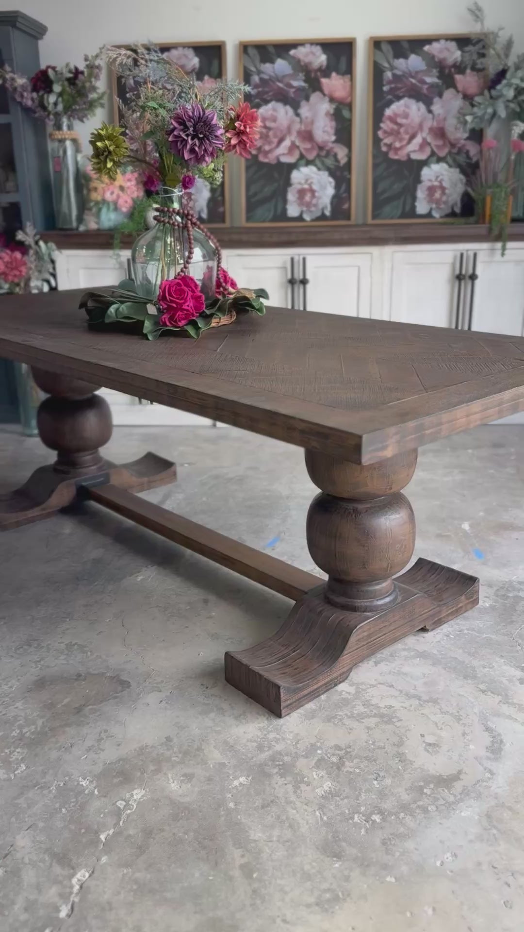Introducing the Myla 8 Foot Table – a stunning blend of modern design and timeless craftsmanship. This showstopper features a beautifully unique double rounded pedestal trestle base, finished in a warm and versatile Honeywood finish and boasting a chevron tabletop. At 8 feet long, Myla provides ample space for gatherings, making her not only a bold statement piece but also a functional masterpiece for dining rooms or entertaining spaces. The mix of rich and natural soft tones and captivating design makes the Myla table an ideal choice for those seeking both style and substance in their home.