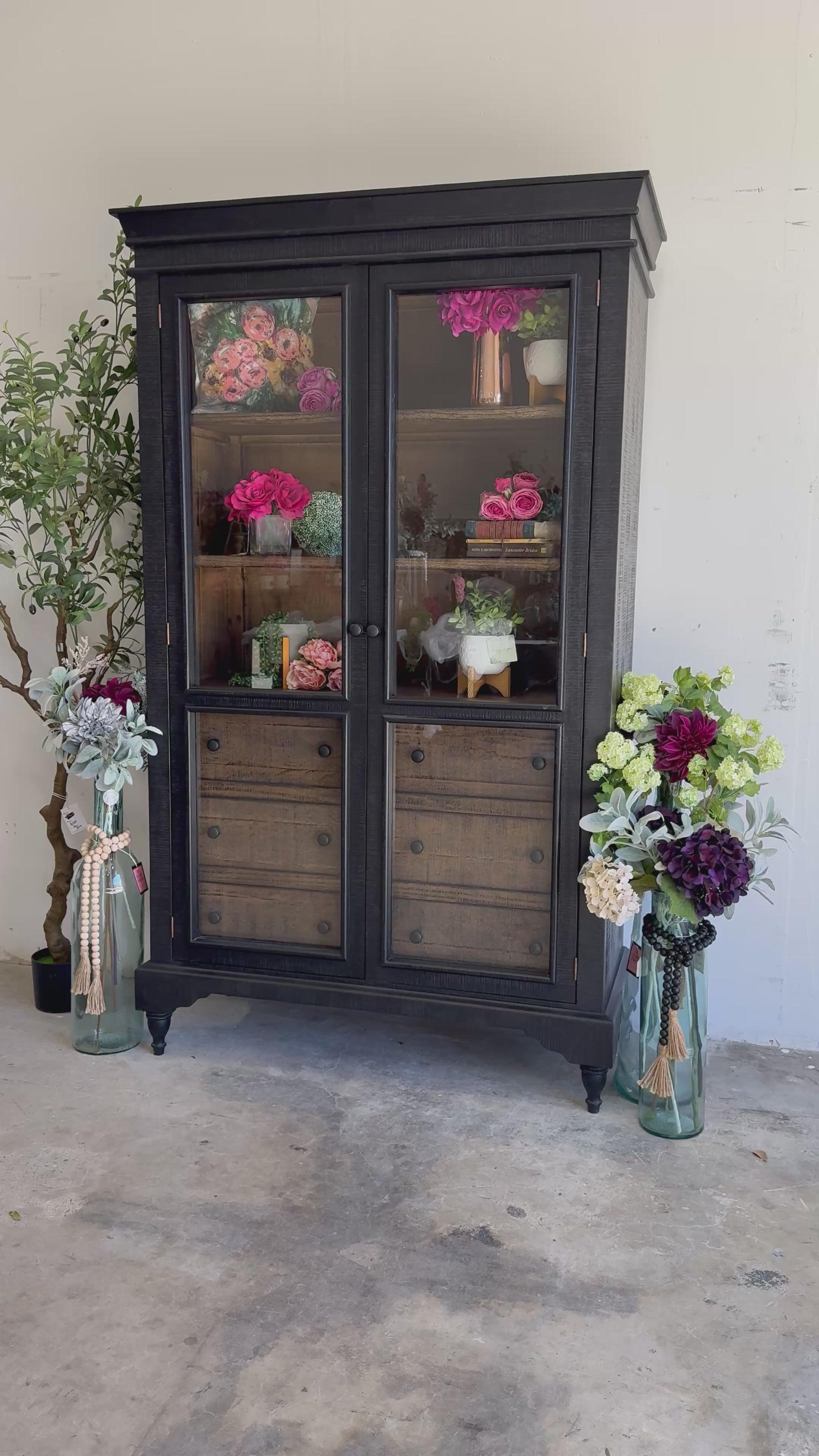 Her bold, hand-rubbed black exterior gives ✨mysterious allure✨ while her glowing Honeywood™ interior brings the cozy warmth. A little dark and moody on the outside, golden on the inside — she’s the furniture equivalent of “don’t judge a book by its cover.”