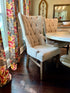 Oversized and stunning these will be a gorgeous addition to any table or as an accent chair in your room. With an extra tall and rounded back, these fully upholstered chairs come in an Ivory upholstery with stained legs. Each chair features a tufted back with nail head trim.